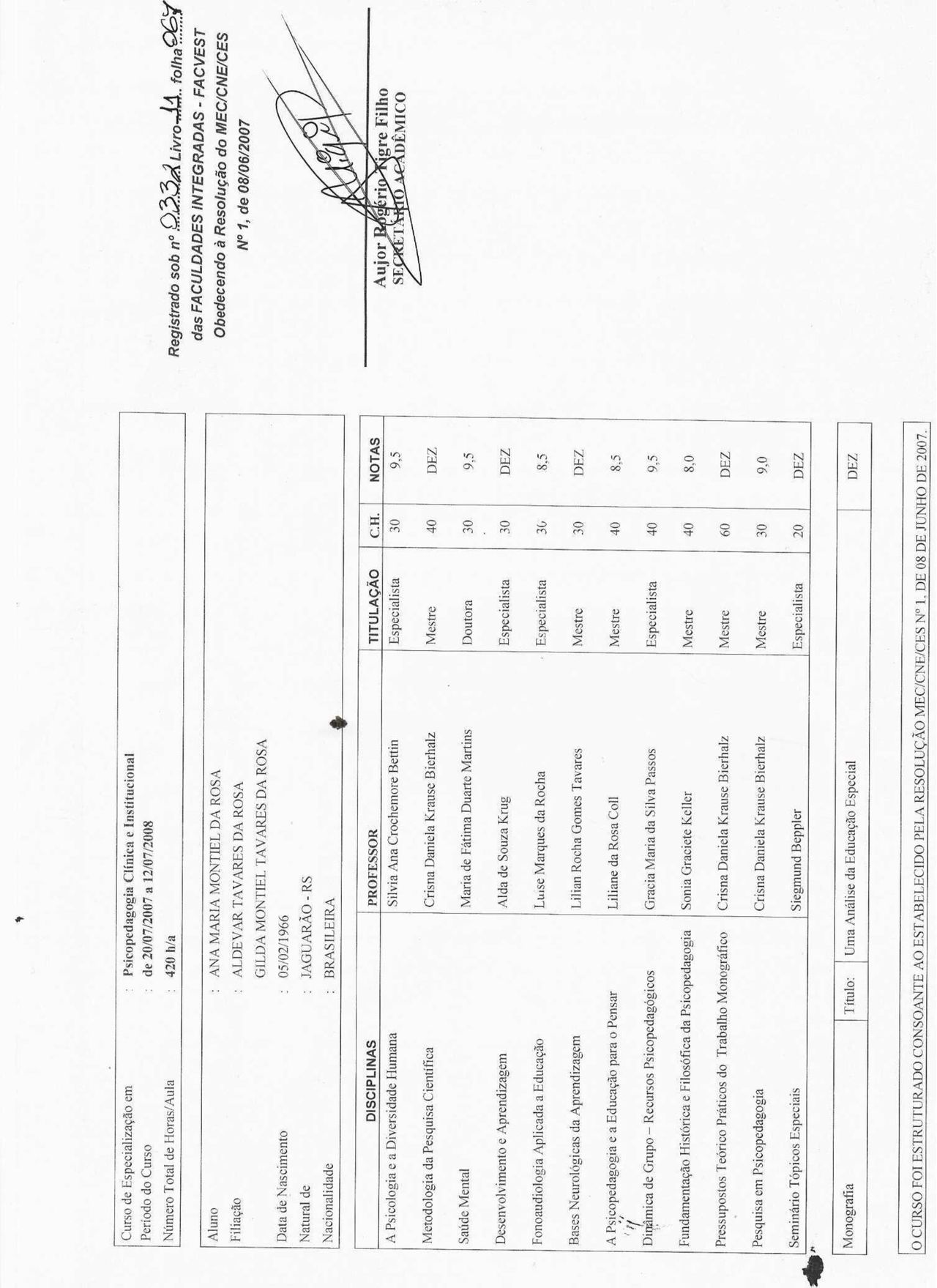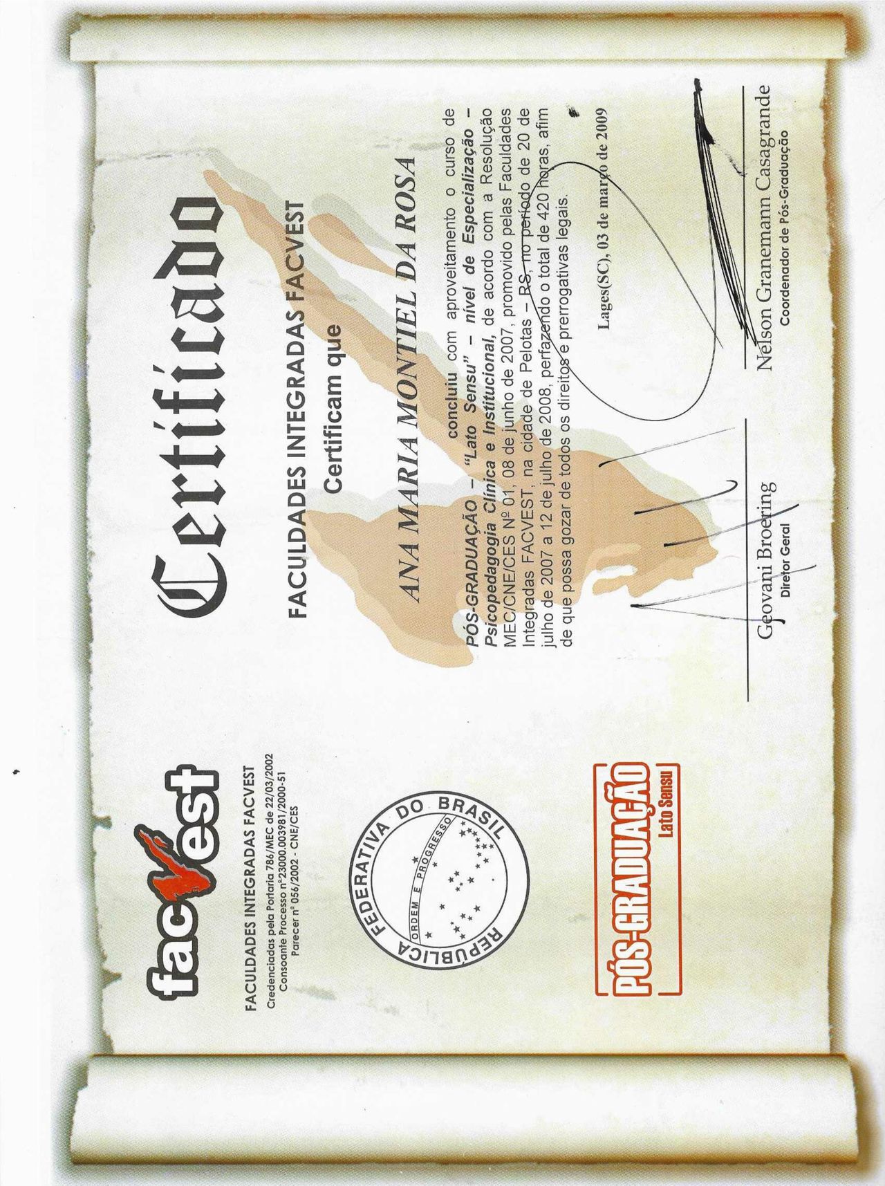 - Especialização em Psicopedagogia clinica e Institucional-Faculdades Integradas FaCvest 360 horas